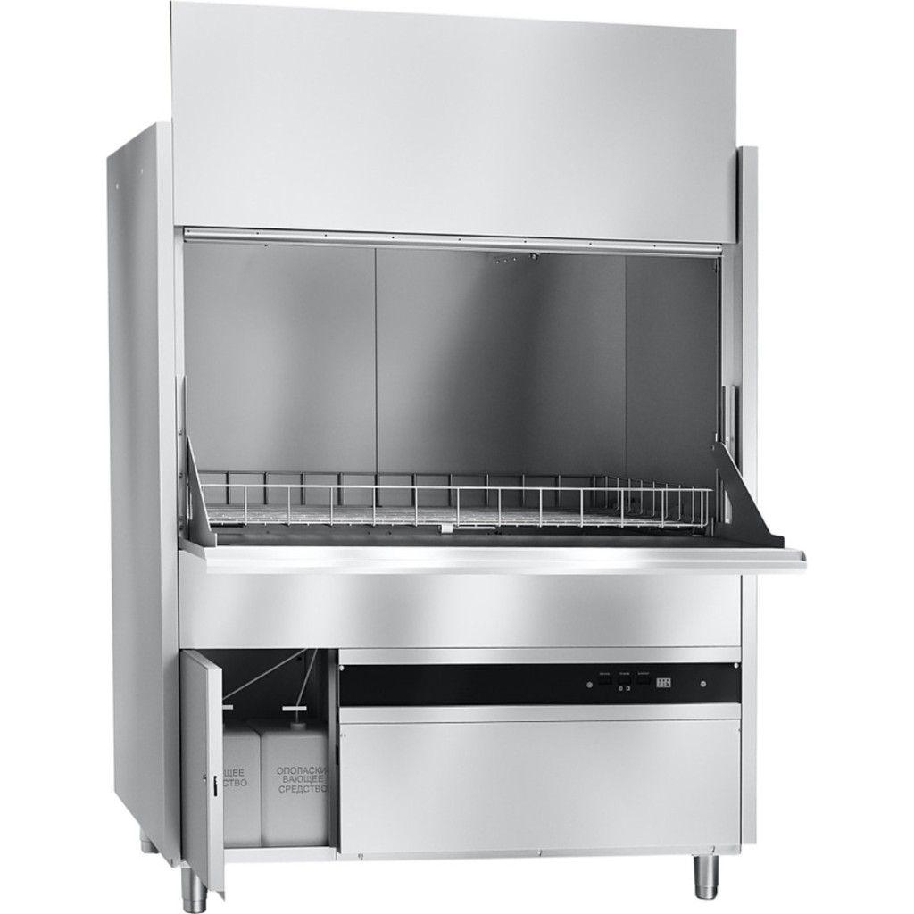 Модель оснащена электронной панелью управления, вместительной моечной ванной со скругленными углами для облегчения санитарной обработки и поставляется в комплекте с выкатной тележкой на роликах, а также съёмными держателями №20, №45, №65 и сеткой для мойки лёгких предметов.