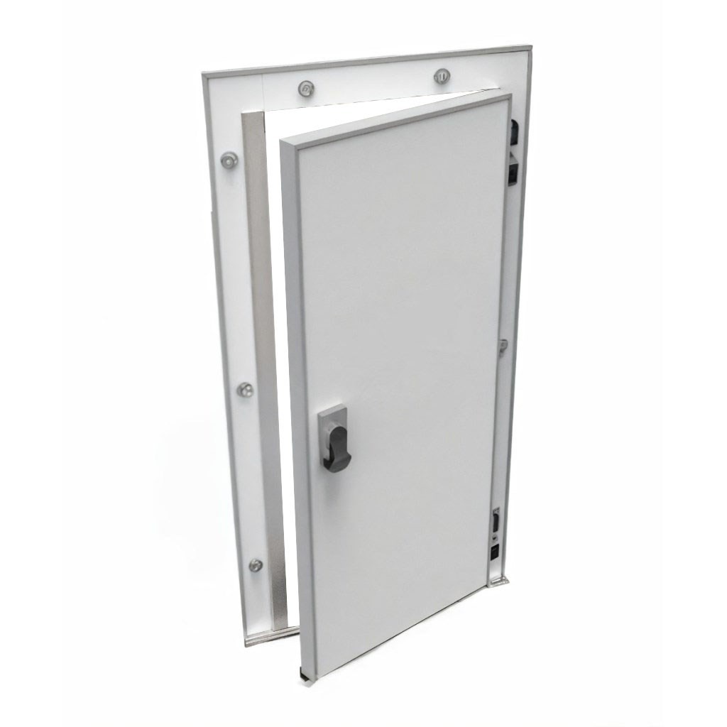 Конструкция: прочная рама из анодированного алюминия устойчива к коррозии, дверное полотно покрыто оцинкованной сталью толщиной 0,45–0,65 мм с полиэфирным слоем (RAL 9003), что обеспечивает долговечность и гигиеничность.