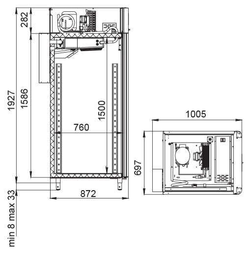 Каталог оборудования Холодильное оборудованиеШкафы холодильныеСпециализированные холодильные шкафыШкаф холодильный для вызревания салями Polair CS107 Salami черный, со стеклом Шкаф холодильный для вызревания салями Polair CS107 Salami черный, со стеклом Код товара: 062-632 Поделиться: WhatsAppTelegram СравнитьДобавить в КПВ избранное 0 373 915 ₽ В корзину 0 шт Под заказСамовывоз сегодня бесплатно Взять в кредит Купить в лизинг Получить консультацию в WhatsApp Описание Характеристики Отзывы 0 Инструкции 5 Шкаф холодильный для вызревания салями Polair CS107 Salami черный, со стеклом предназначен для приготовления и хранения салями, сыровяленых колбас и других мясных деликатесов на предприятиях общественного питания и торговли. Цельнозаливной монолитный корпус выполнен из нержавеющей стали снаружи и внутри (кроме задней стенки), что обеспечивает высокую прочность, долговечность и удобство ухода. Оборудование рассчитано на работу при температуре окружающей среды до +40 °С. Особенности: Динамическое охлаждение с мягким обдувом без заветривания Верхнее расположение агрегата Автоматическая оттайка с системой испарения конденсата Русифицированная многофункциональная панель управления с дисплеем диагональю 5" Возможность создания и сохранения индивидуальных программ Встроенный ультразвуковой увлажнитель (необходима подача очищенной воды и подключение к канализации) UV-лампа для обеззараживания воздуха внутри камеры Три уровня подвесов с тремя перекладинами и крюками на каждом уровне для удобной развески колбас Регулируемый уровень влажности: от 60 до 95 % Распашная дверь с заливной теплоизоляцией, встроенной ручкой и магнитным уплотнителем Отключаемая LED-подсветка камеры Штампованное углубление в дне корпуса для удобства ухода Педаль для удобного открытия двери Хладагент R290 (пропан) Толщина стенки корпуса: 43 мм Polair CS107 Salami черный, со стеклом — это профессиональный холодильный шкаф, идеально подходящий для цехов, гастробаров и мясных мастерских. Он обеспечивает оптимальные условия для дозревания и хранения деликатесов за счёт точного контроля температуры и влажности, продуманной конструкции и расширенного функционала. Такой шкаф помогает сохранять качество и вкус продукции на высоком уровне.Изображение товара, представленного на фото, может отличаться от его фактического вида. Показать все Габаритные размеры697×1005×1960 ммДиапазон рабочей температурыот -2 до +30 °CДлина697 ммШирина1005 ммВысота1960 ммОбъём700 лКол-во дверей1 Тип двериСтеклянная Уровень влажностиот 60 до 95 %Холодильный агрегатВстроенный Тип оттайкиАвтоматическая Тип охлажденияДинамическое ПодсветкаЕсть UV-лампаЕсть ХладагентR290 Вес нетто160 кгВес брутто190 кгБрендPolairВсе специализированные холодильные шкафы Из нержавейкиВсе специализированные холодильные шкафы Стеклянная дверь Оставить отзыв Еще никто не оставил отзыв на этот товар Схема POLAIR CS107 Salami.jpgИнструкция на POLAIR CS107 Salami.pdfБрошюра на POLAIR CS107 Salami.pdfДекларация о соответствии.pdfСертификат соответствия.pdf Похожие товары Перейти в каталог Под заказ 392 700 ₽ Шкаф холодильный для вызревания мяса Polair CS107 Meat черный, со стеклом (Тип 2) Под заказ 169 915 ₽ Шкаф холодильный для хлебопекарных производств Polair CS107 Bakery Bs Под заказ 391 000 ₽ Шкаф холодильный для вызревания сыра Polair CS107 Cheese полки нерж. Под заказ 405 450 ₽ Шкаф холодильный для хлебопекарных производств Pol