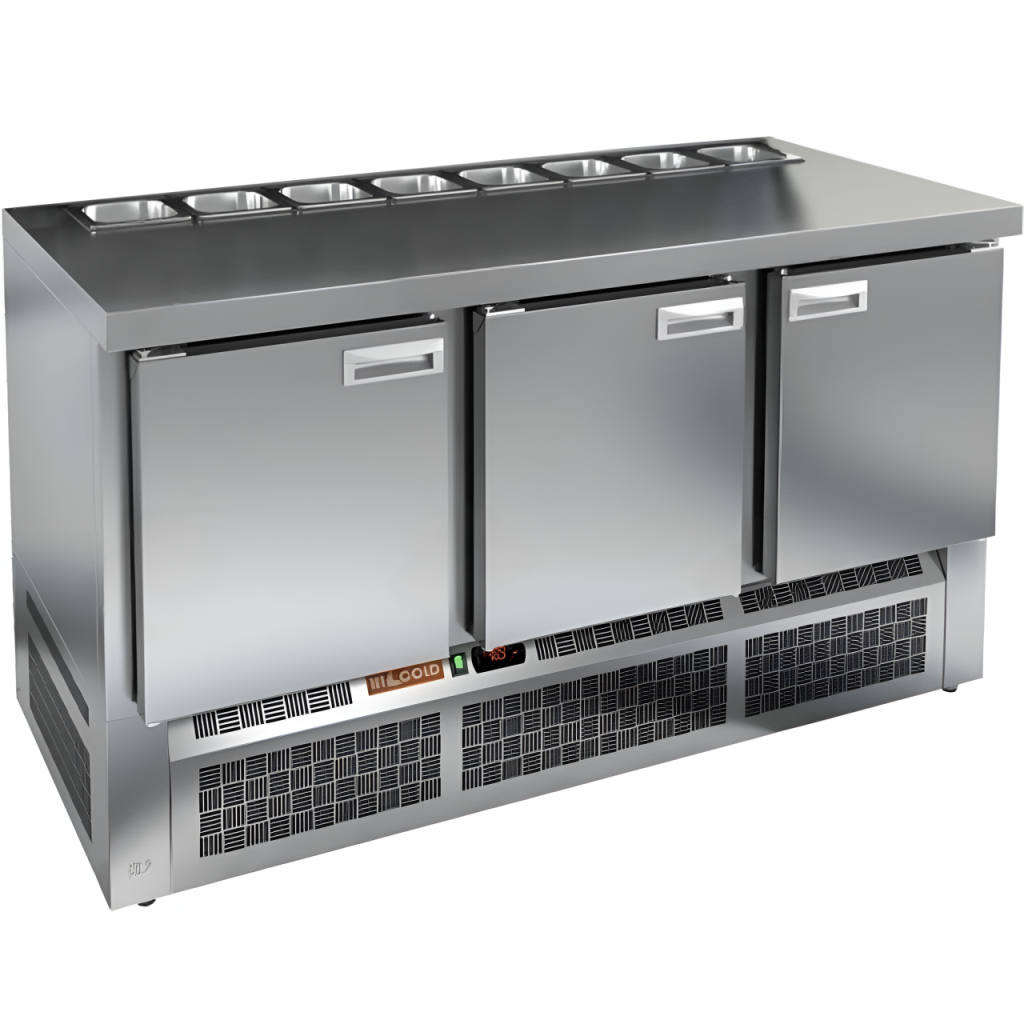 Каталог оборудования Холодильное оборудованиеСтолы охлаждаемыеСтолы холодильные для салатовСтол холодильный для салатов HiCold SLE2-111GN (1/6) О без крышки Стол холодильный для салатов HiCold SLE2-111GN (1/6) О без крышки Код товара: 064-866 Поделиться: WhatsAppTelegram СравнитьДобавить в КПВ избранное 0 144 082 ₽ В корзину 0 шт Под заказСамовывоз сегодня бесплатно Взять в кредит Купить в лизинг Получить консультацию в Max Описание Характеристики Отзывы 0 Инструкции 2 Стол холодильный для салатов HiCold SLE2-111GN (1/6) О без крышки предназначен для предприятий общественного питания и торговли. Он используется для хранения, охлаждения и обработки ингредиентов, применяемых при приготовлении салатов, пиццы, закусок и других блюд. Модель объединяет удобную рабочую поверхность и охлаждаемый отсек, позволяя повару иметь все необходимое под рукой. Конструкция выполнена из прочной нержавеющей стали, устойчивой к коррозии и легкой в уходе. Особенности модели: Электронная панель управления — точная настройка температуры и контроль за режимами работы. 3 вместительные внутренние полки — рациональное распределение хранения. Салат-бар вмещает 8 гастроемкостей — оптимальная организация ингредиентов. Автоматические доводчики дверей с фиксацией в открытом положении — удобно при загрузке и выгрузке продуктов. Магнитные уплотнители — легко заменяются, обеспечивая герметичность. Открытая агрегатная часть — упрощает техническое обслуживание. Регулируемые по высоте ножки — позволяют установить оборудование на любой поверхности. Глубина гастроемкостей — до 100 мм. Толщина столешницы и теплоизоляции — по 50 мм, что способствует сохранению холода и прочности конструкции. HiCold SLE2-111GN (1/6) О без крышки — это функциональный и надёжный салатный стол, сочетающий в себе удобство работы и эффективное охлаждение. Отличное решение для кухни с интенсивной нагрузкой. Изображение товара, представленного на фото, может отличаться от его фактического вида. Показать все Габаритные размеры1485×700×850 ммДиапазон рабочей температурыот +2 до +10 °CРасположение агрегатаНижнее Материал столешницыНержавеющая Тип столаС дверьми Тип двериГлухая Объём375 лКоличество дверей3 штТип гастроемкостейGN 1/6 Размер полки530×325 ммНапряжение220 ВМощность0,22 кВтТип охлажденияДинамическое Тип оттайкиАвтоматическая СтолешницаБез борта Габариты в упаковке1700×850×1080 ммВес нетто115 кгВес брутто160 кгБрендHicold Оставить отзыв Еще никто не оставил отзыв на этот товар Паспорт на HICOLD SLE2-111GN О.pdfДекларация о соответствии.pdf Ранее просмотрено Под заказ 178 192 ₽ Стол холодильный для салатов HiCold SLE1-112GN (1/3) с крышкой