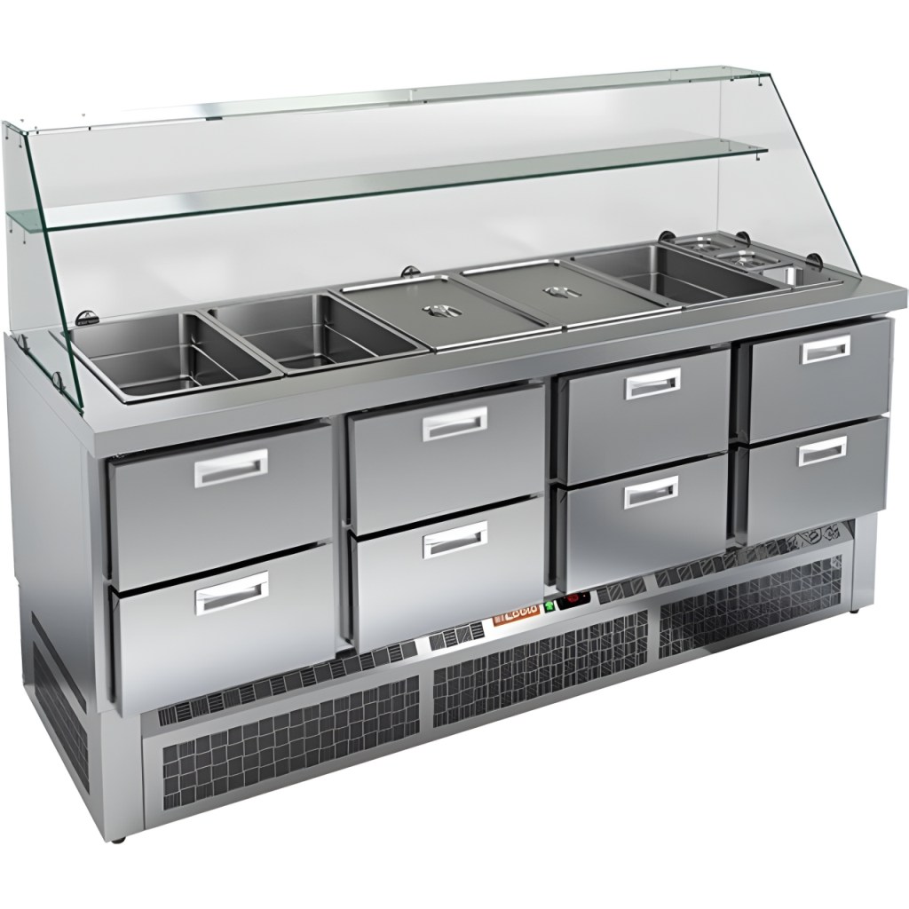 Модель обеспечивает удобный доступ к продуктам и позволяет повару работать максимально эффективно. Корпус и столешница изготовлены из нержавеющей стали, что гарантирует долговечность конструкции, устойчивость к коррозии и соответствие санитарным нормам. Дополнительным преимуществом является высокое защитное стекло, которое обеспечивает гигиеничность выкладки и удобство при обслуживании гостей.