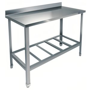 Конструкция стола обеспечивает прочность и стабильность при эксплуатации. Каркас изготовлен из уголка оцинкованной стали, а рабочая поверхность — из нержавеющей стали AISI 430 с внутренним усилением листом ЛДСП толщиной 16 мм. В комплект входит прочная полка-решетка, выполненная из оцинкованной стали, для хранения кухонных принадлежностей или тары.