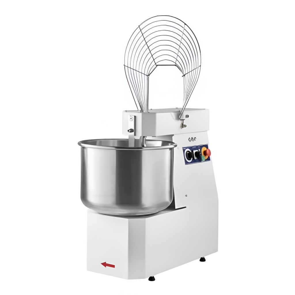 Аппарат оснащен двумя скоростями и работает на устойчивом ременно-цепном приводе. Управление осуществляется с помощью простой и надежной электромеханической панели. Спираль вращается плавно и стабильно благодаря мотору-редуктору, эксцентричное движение в данной модели не предусмотрено. Тем не менее, замес получается равномерным, а сам процесс проходит практически бесшумно. Спираль выполнена с увеличенным сечением для большей прочности, а зазор между дном дежи и мешающим элементом составляет всего 3–5 мм, что способствует эффективному замесу.